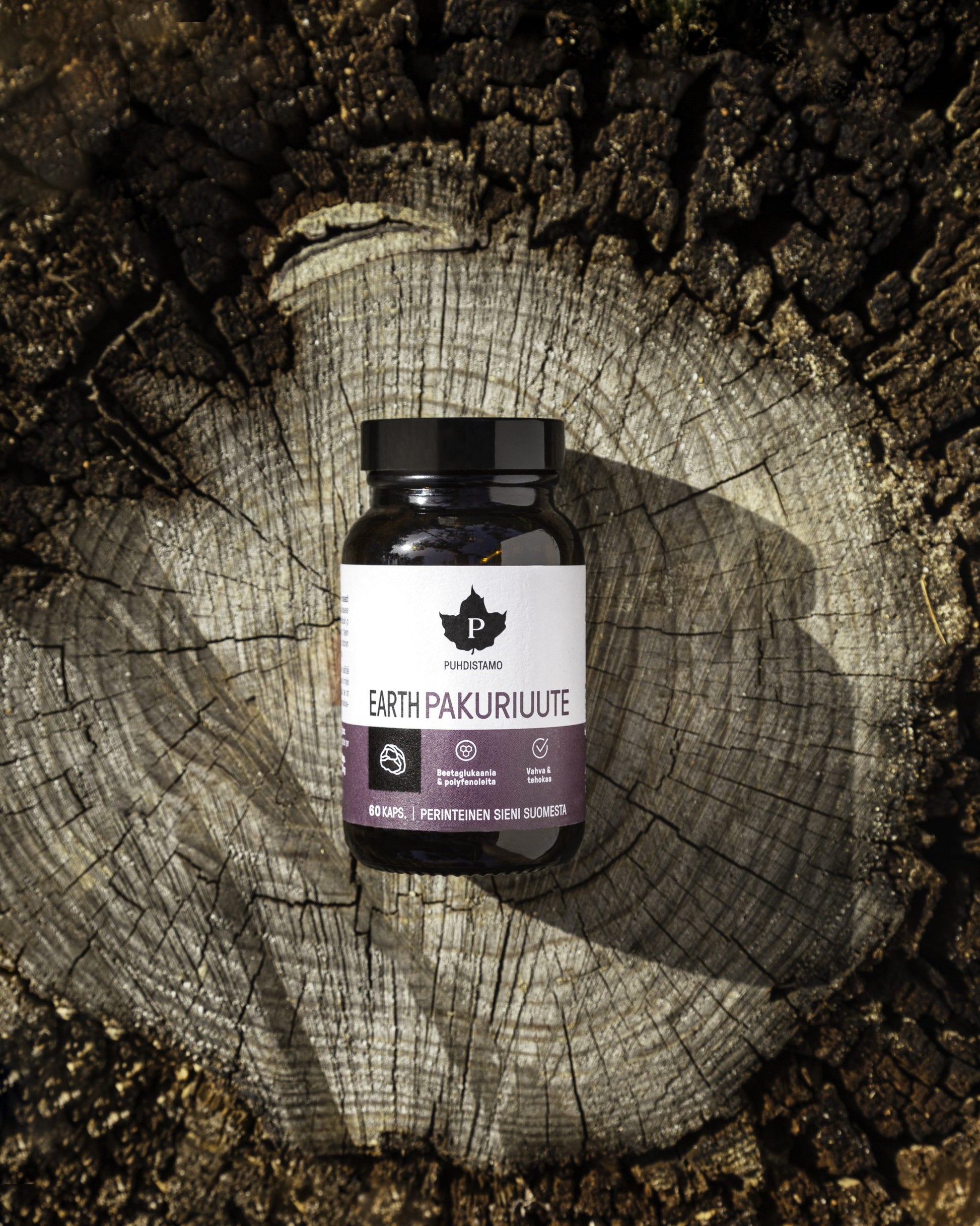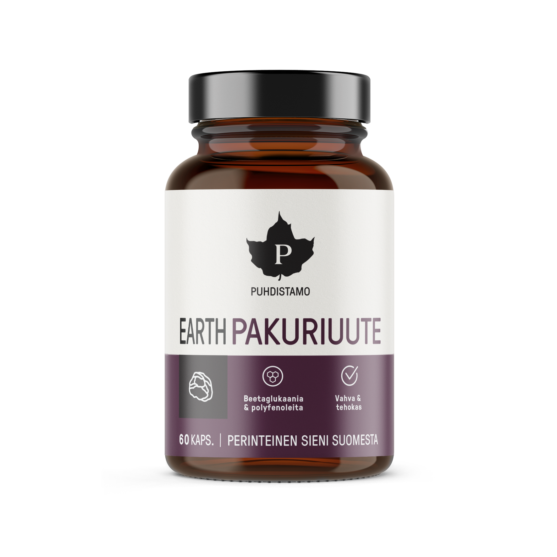 "Puhdistamo Earth Pakuriuute" – tai visiškai natūrali čagos grybo versija, kurią lengva vartoti kapsulėmis. Čagos grybas yra vienas iš Suomijos gamtos klasikinių grybų ir viena iš labiausiai vertinamų žaliavų.